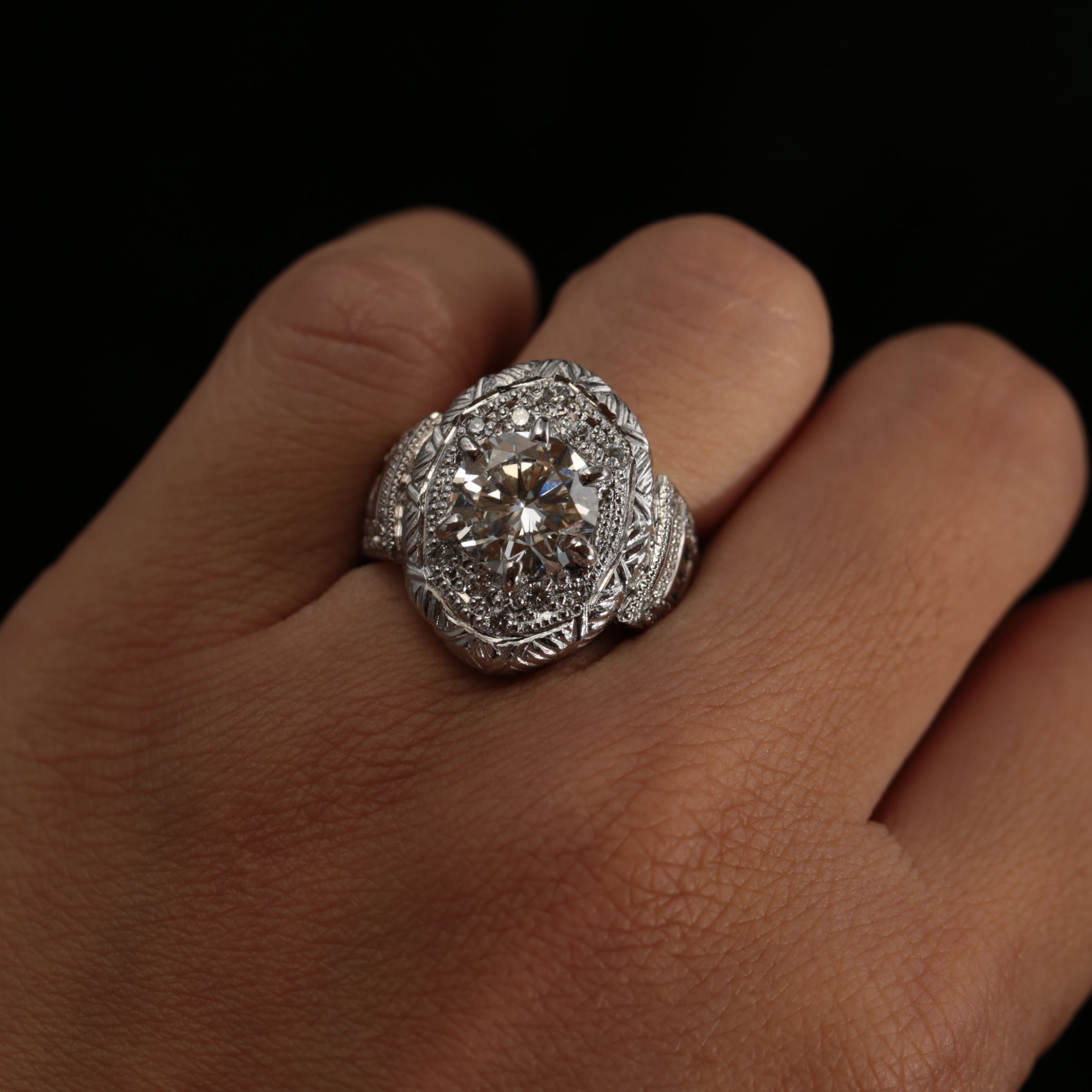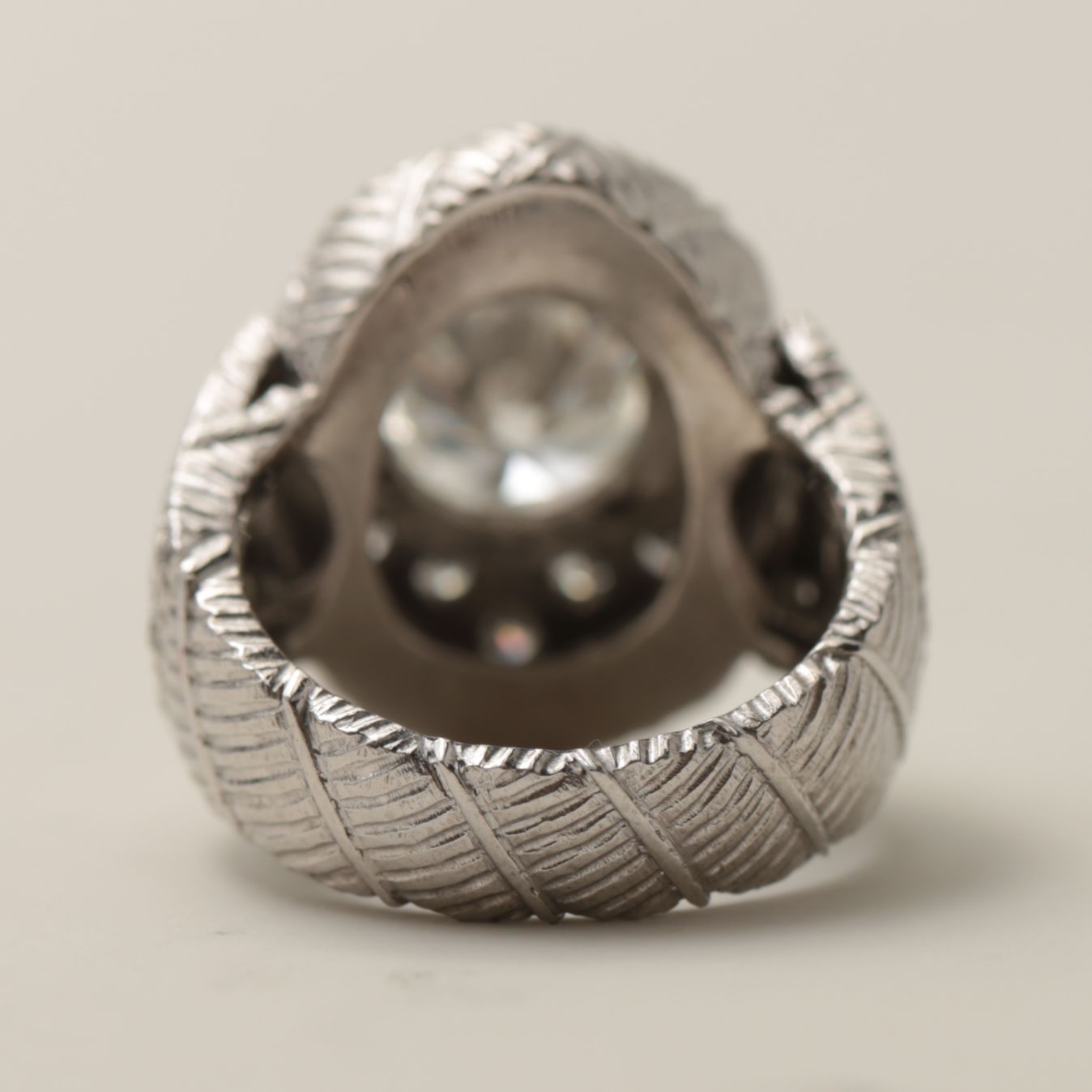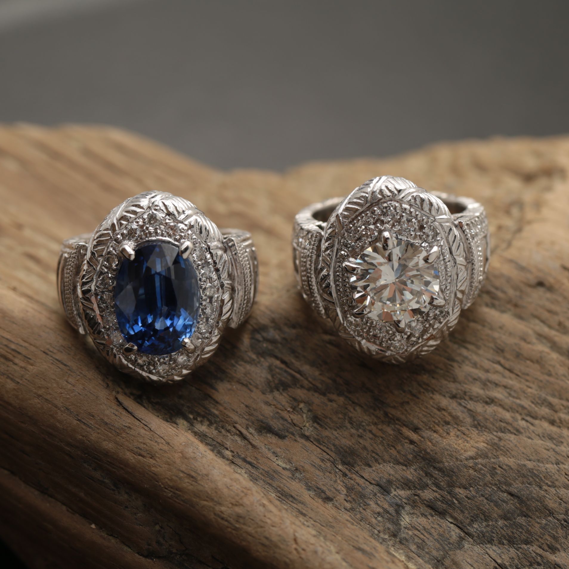 以前お作りしたブルーサファイアのリングと並べると、同じ美学を共有しながらも、ダイヤモンドならではの知的でエレガントな表情を見せてくれる、唯一無二の仕上がりとなりました。