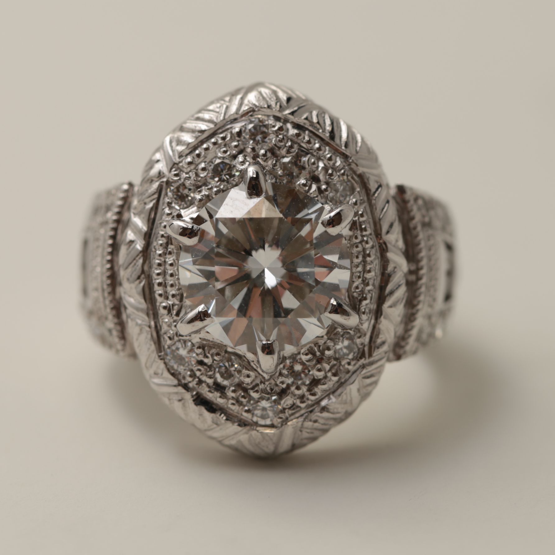 その周囲を囲むのは、時計の緻密なパーツや装飾を彷彿とさせる、手作業による深い彫金とミルグレイン(千粒の雫)の細工です。