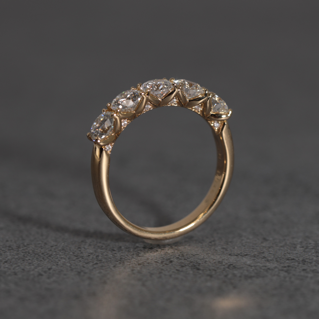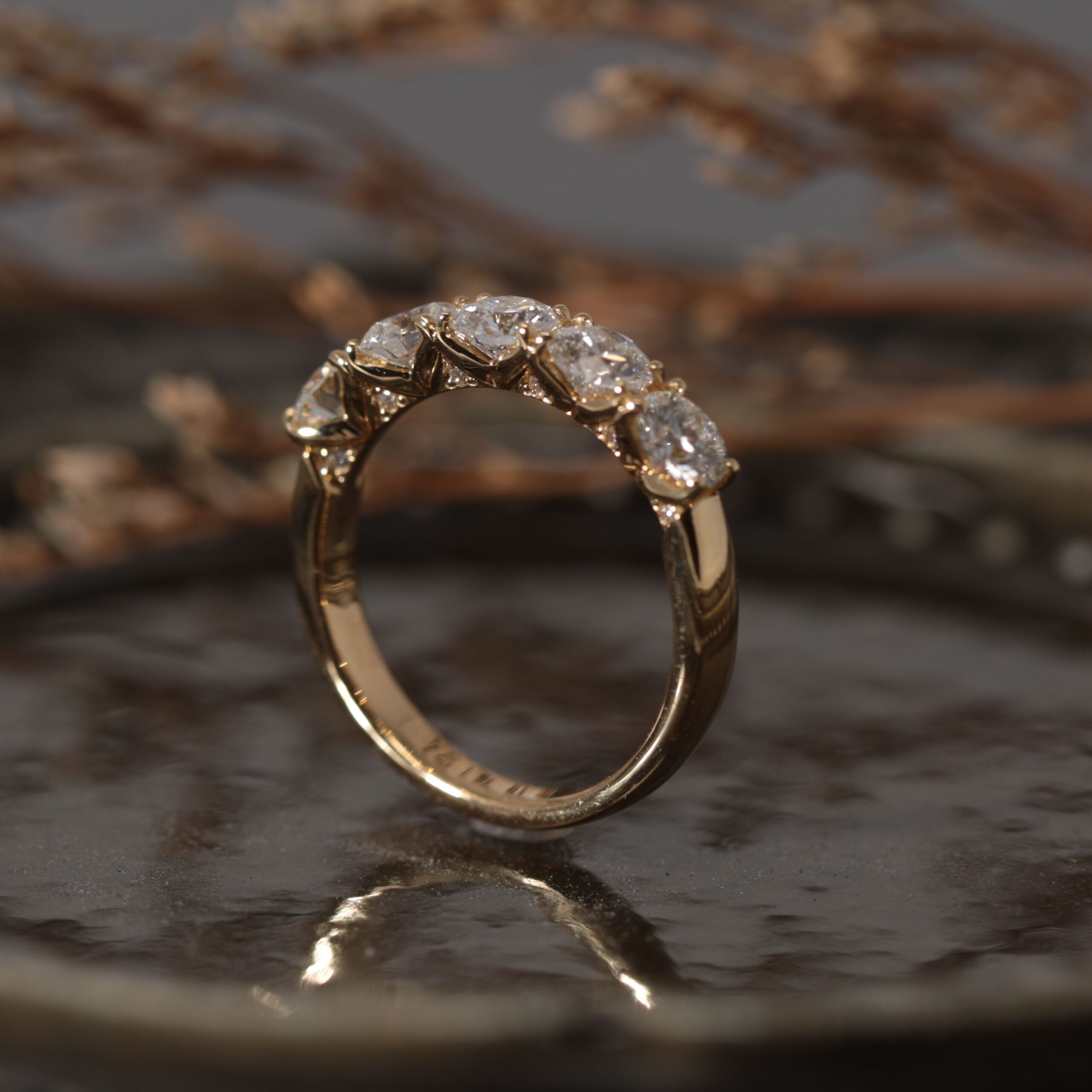 K18イエローゴールド製、0.3カラットのダイヤモンドを5石並べた、特別なハーフエタニティリング。
