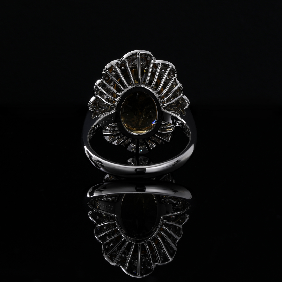 素材にはプラチナ900を使用し、ゴールデンベリルの周囲をダイヤモンドメレで取り巻く、優雅で格調高いデザインに。