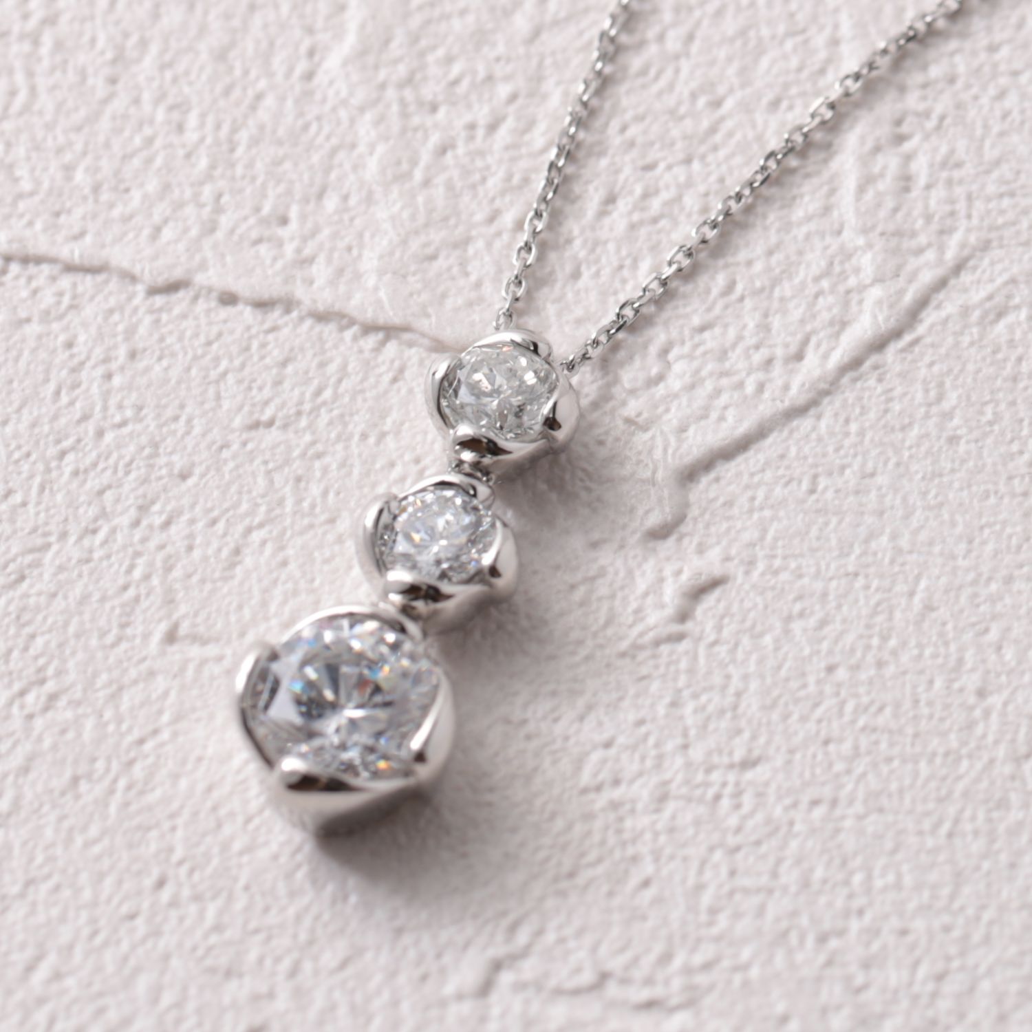 ダイヤモンドのリング、ダイヤモンドのネックレス、そして1ctUPのダイヤモンドルースをお預かりし、3石のダイヤモンドを縦に並べたペンダントへとリフォームいたしました。