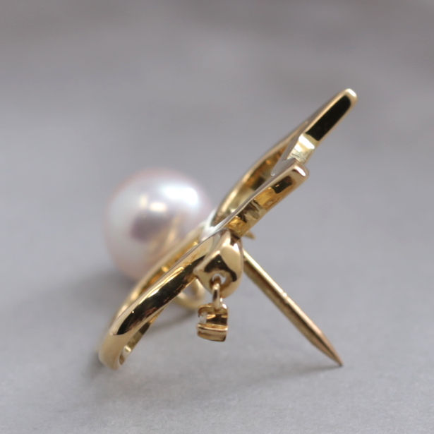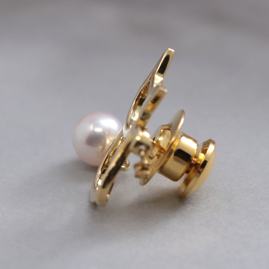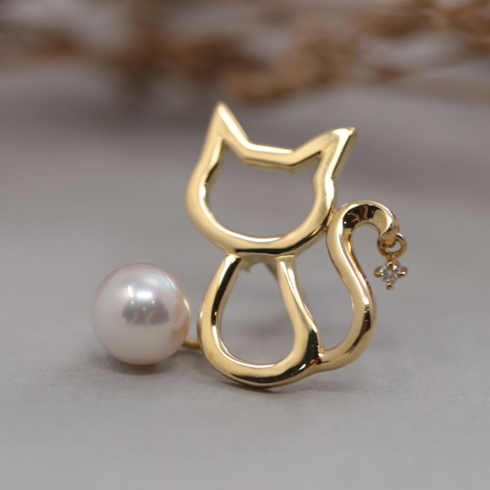 ちょっとだけ首をかしげた愛らしいネコのフォルムに、6.3mmのあこや真珠が寄り添う、遊び心と上品さを兼ね備えたデザインです。