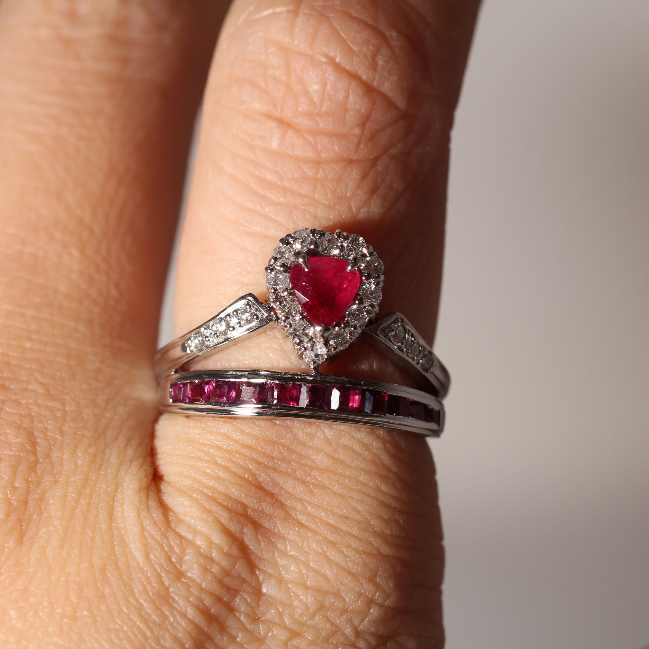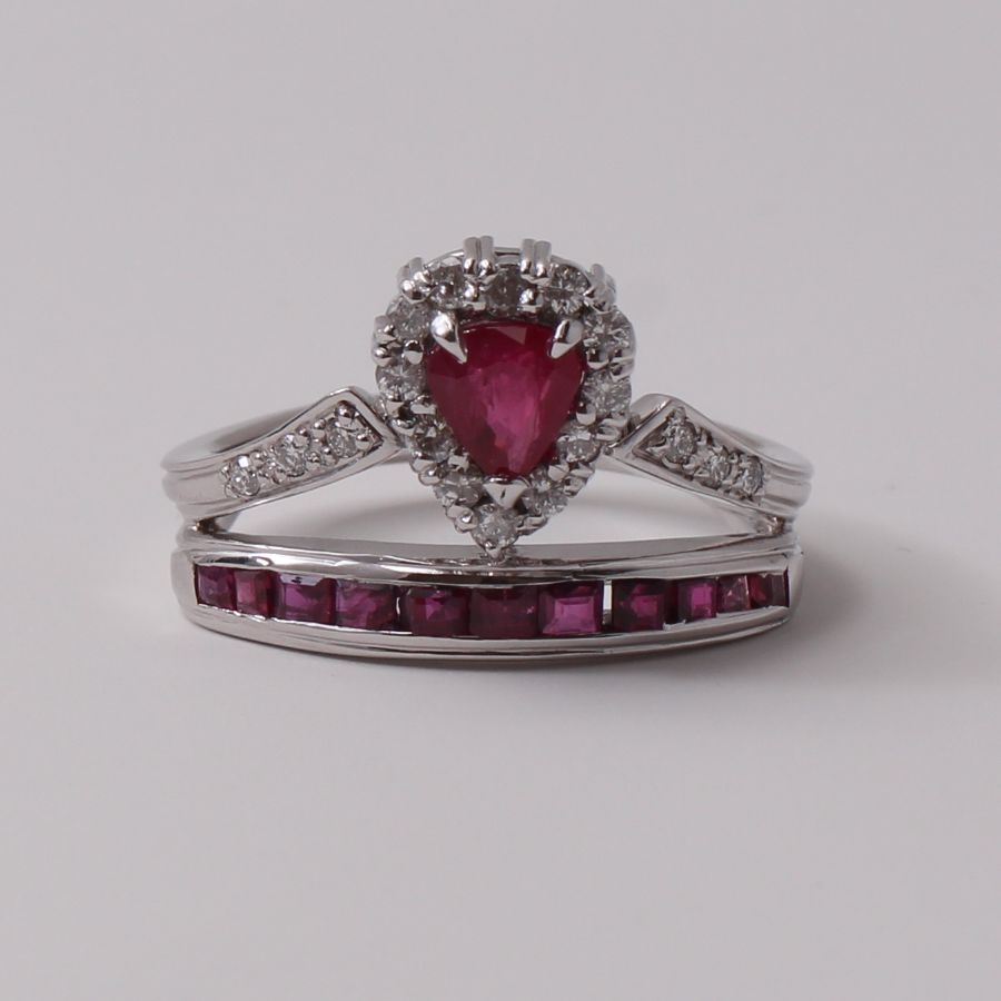 ルビーのメレを一列に並べた端正なハーフエタニティと、ペアシェイプカットのルビーをメレダイヤで取り巻いた華やかなデザイン。