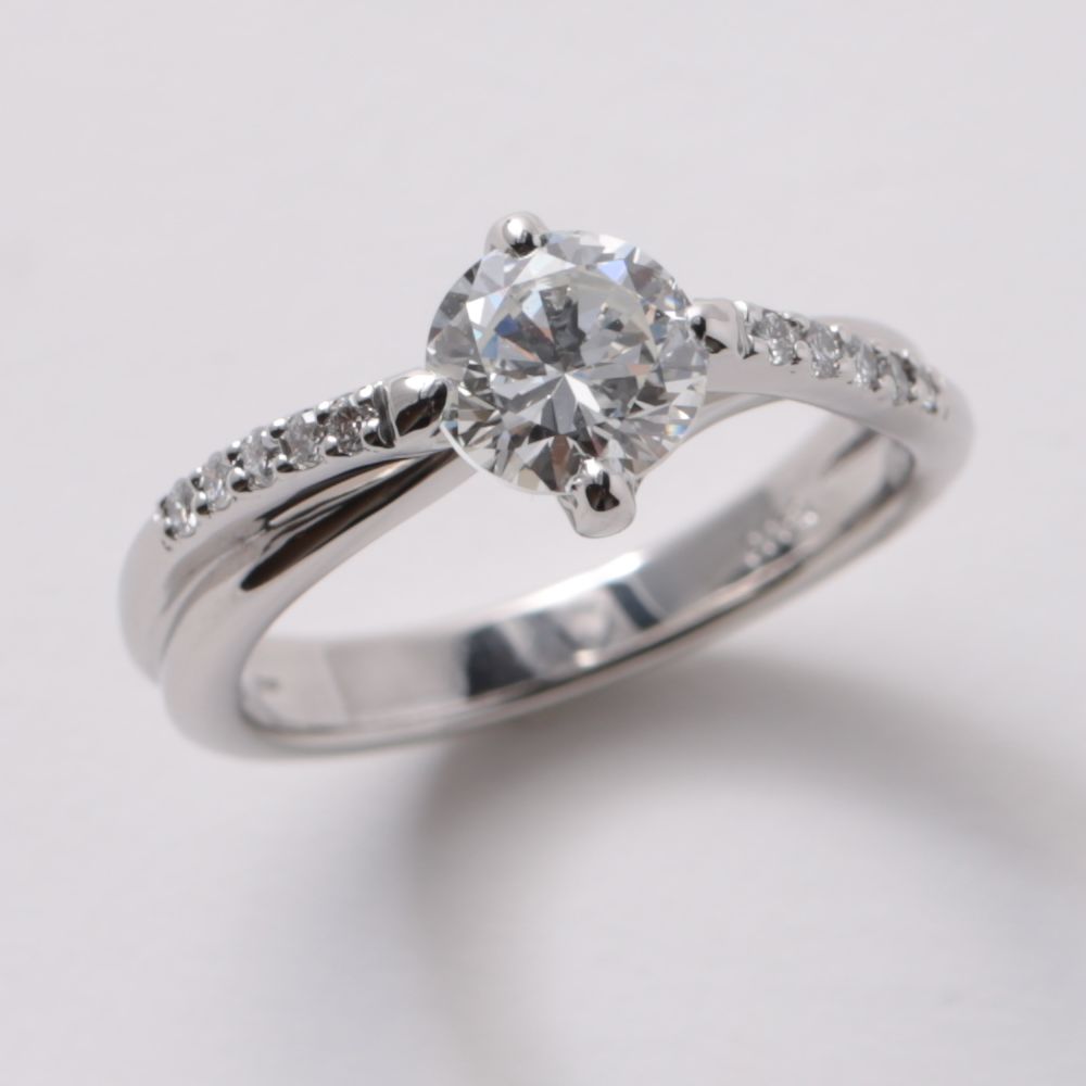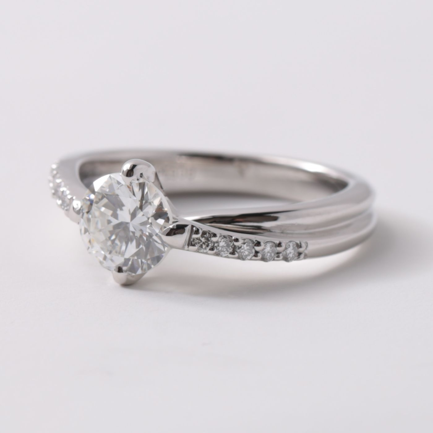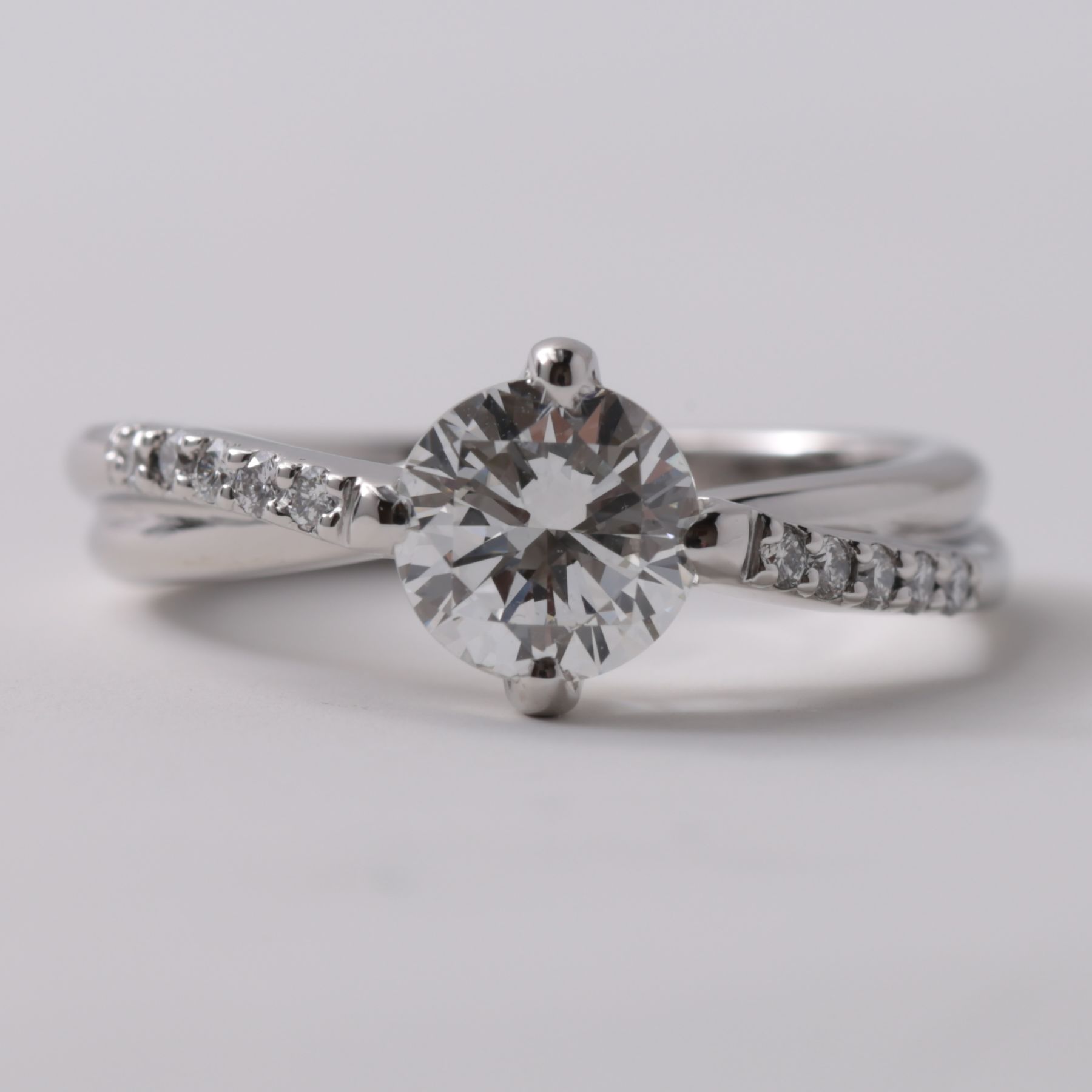 サイドには小さなメレダイヤが連なり、プラチナの滑らかな地金ラインと交差するようなデザイン。