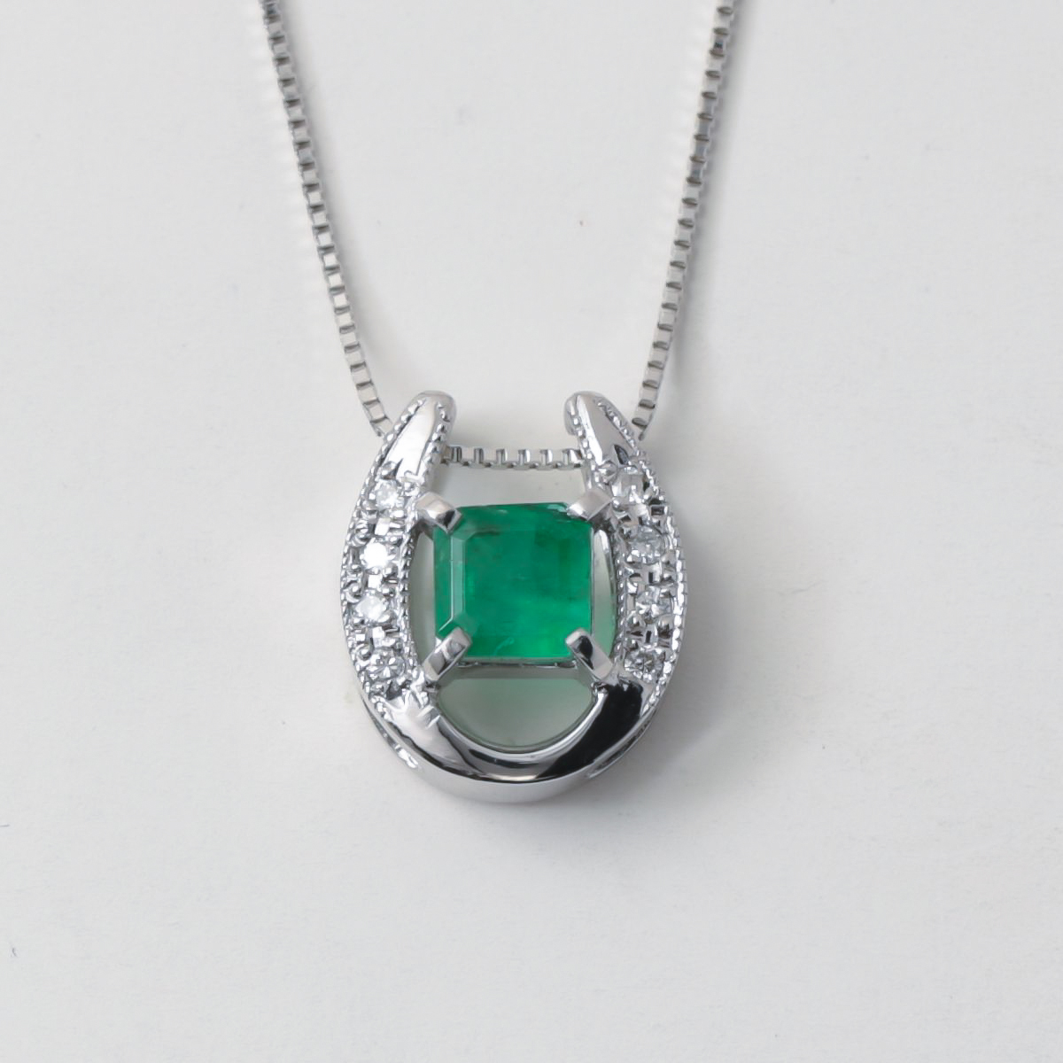 中央に配したエメラルドの澄んだ輝きが、輝く馬蹄に守られるように美しく映え、日常から特別なシーンまで幅広く寄り添います。