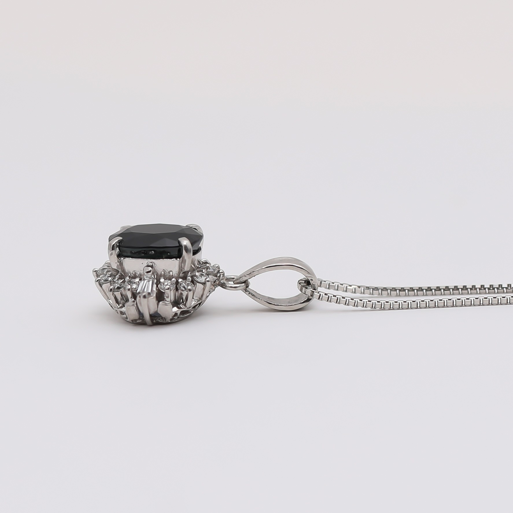 深みのある濃いブルーのストーンが印象的なリングを、胸元でしなやかに輝くペンダントへとリフォームいたしました。Pt900製の本体は、リングのセンターデザインを丁寧に活かし、周囲を取り巻くダイヤモンドが石の澄んだ色彩を一層引き立てます。