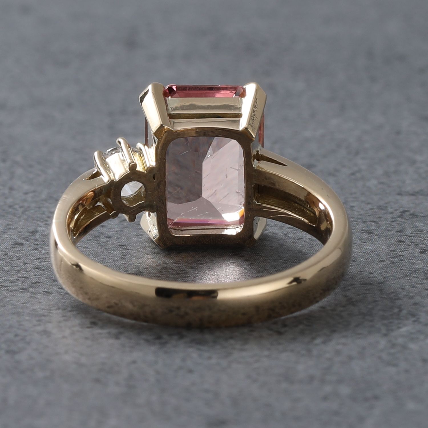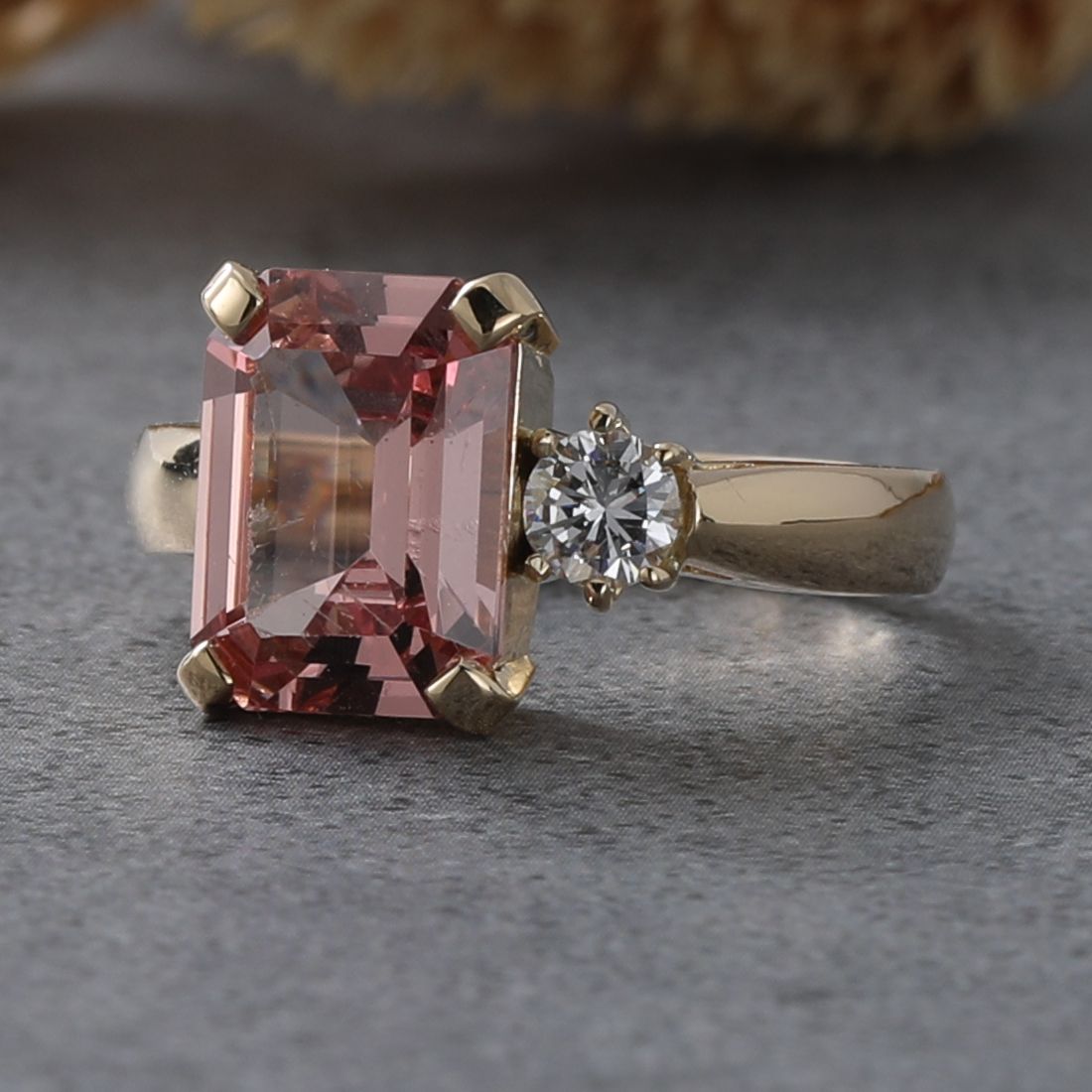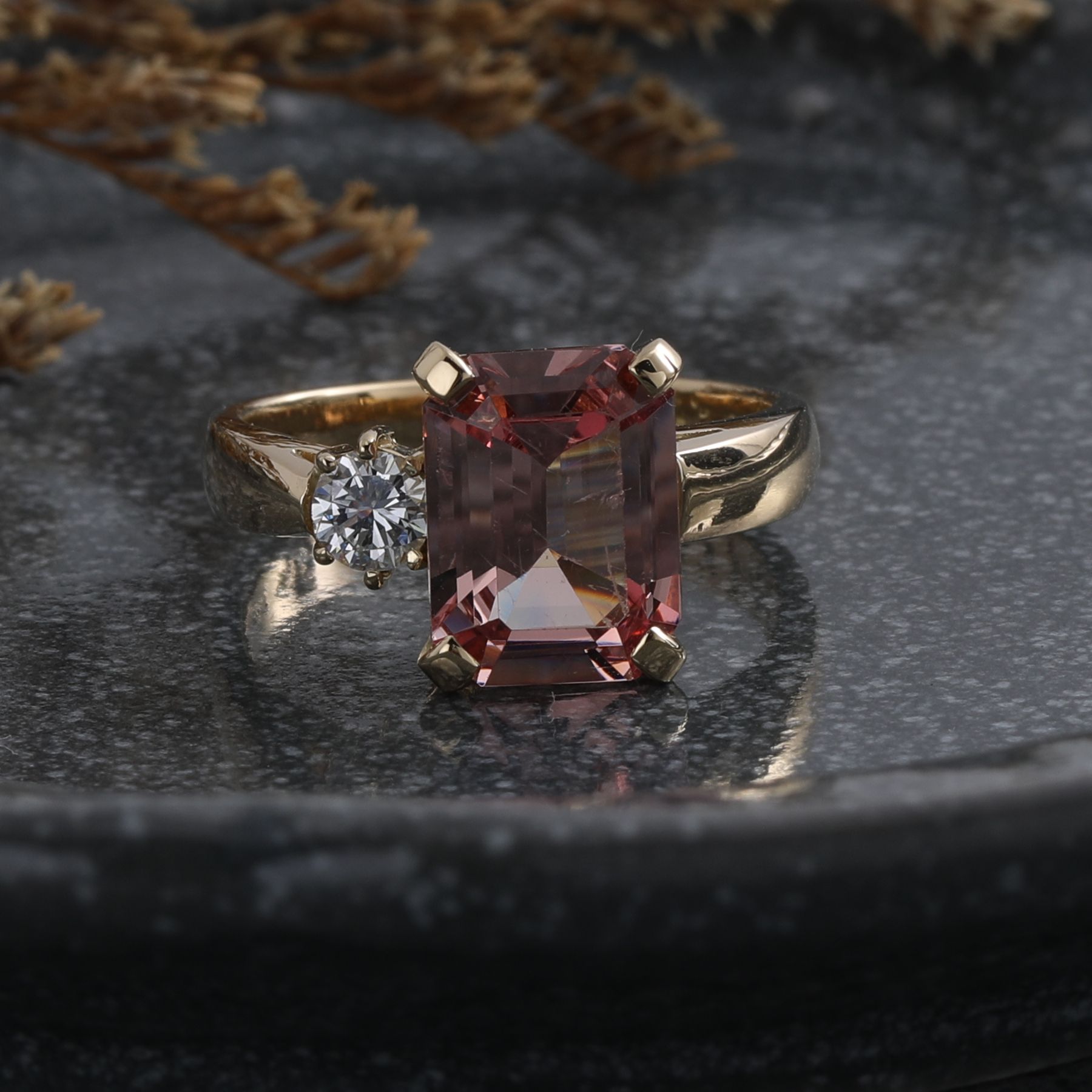 スピネルの持つ甘く柔らかなピンクの彩りに、エメラルドカットならではの直線的なフォルムが寄り添い、可愛らしさに凛とした印象を添えています。