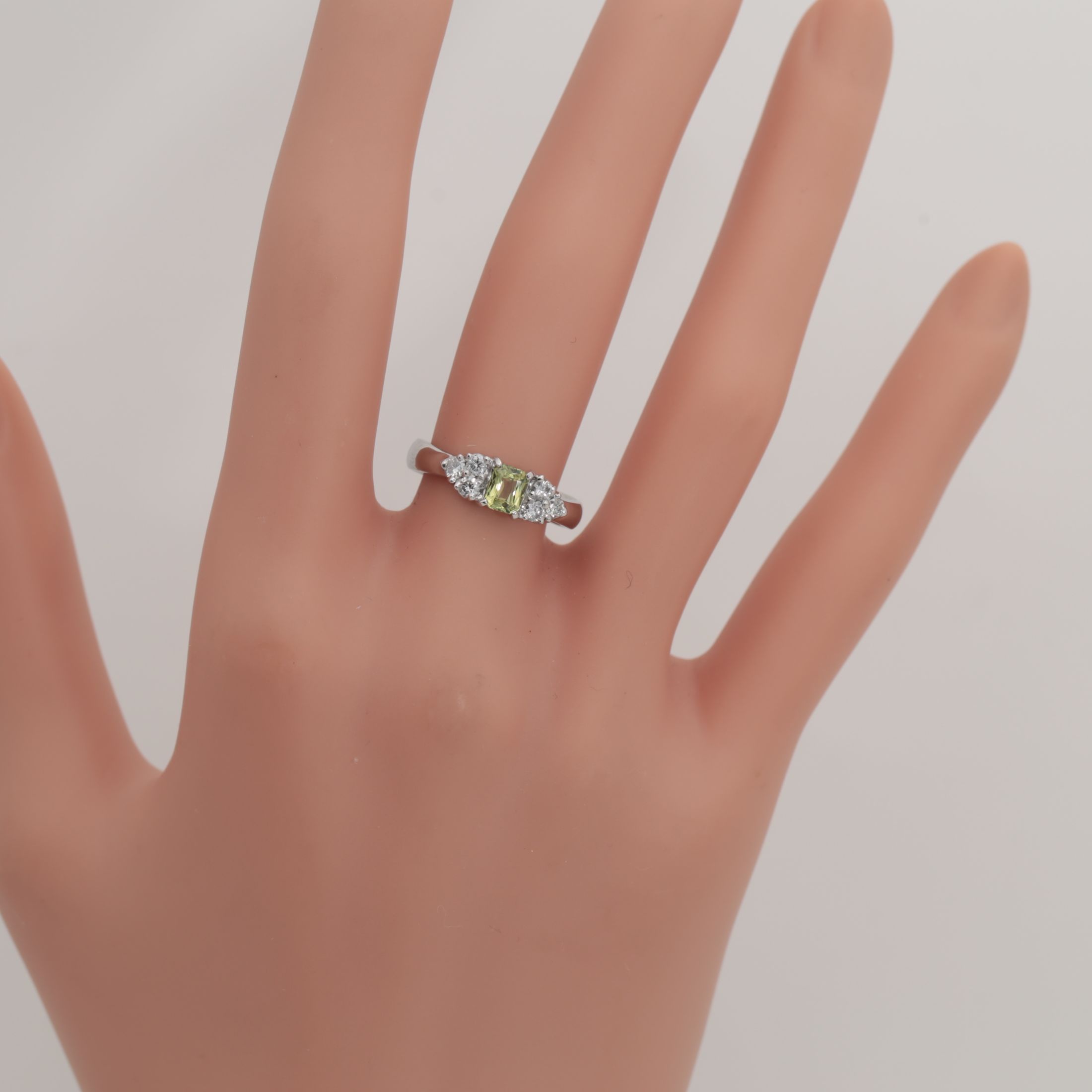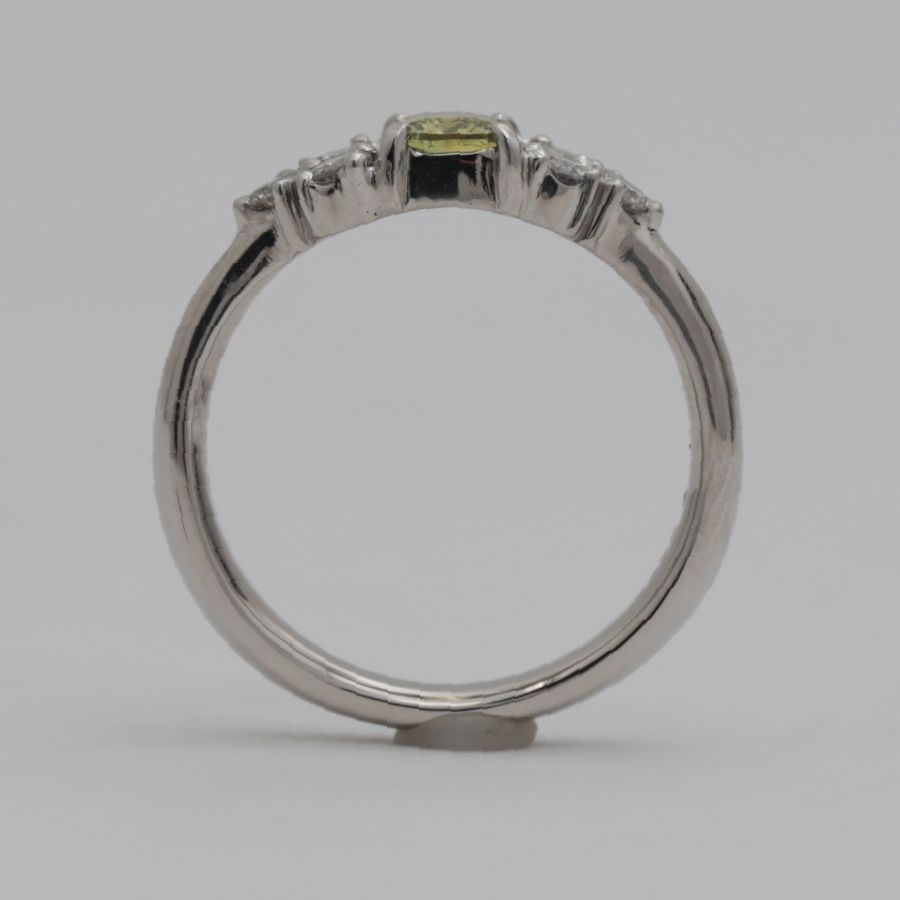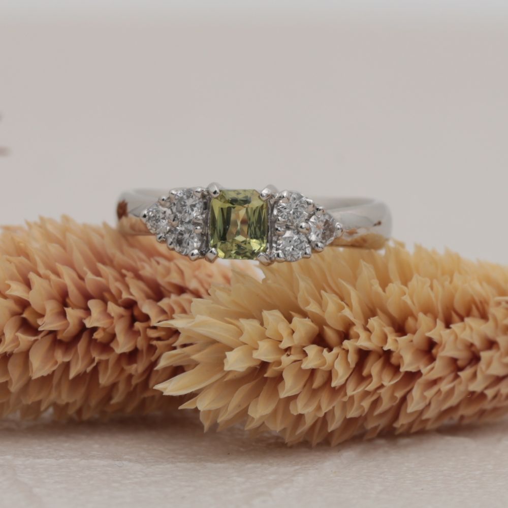 プラチナの清らかな輝きに、イエローグリーンのサファイアが鮮やかに映えるリングをお仕立ていたしました。
