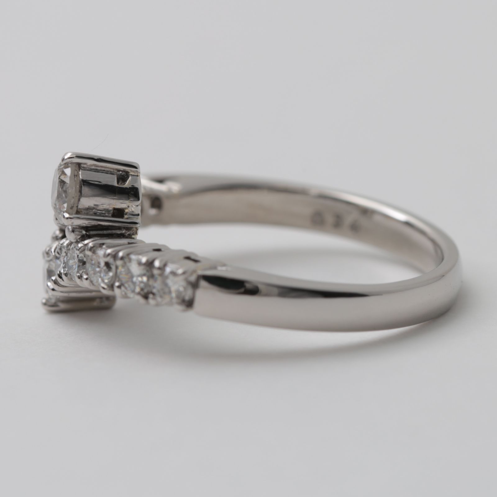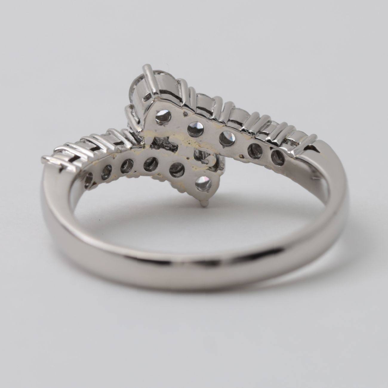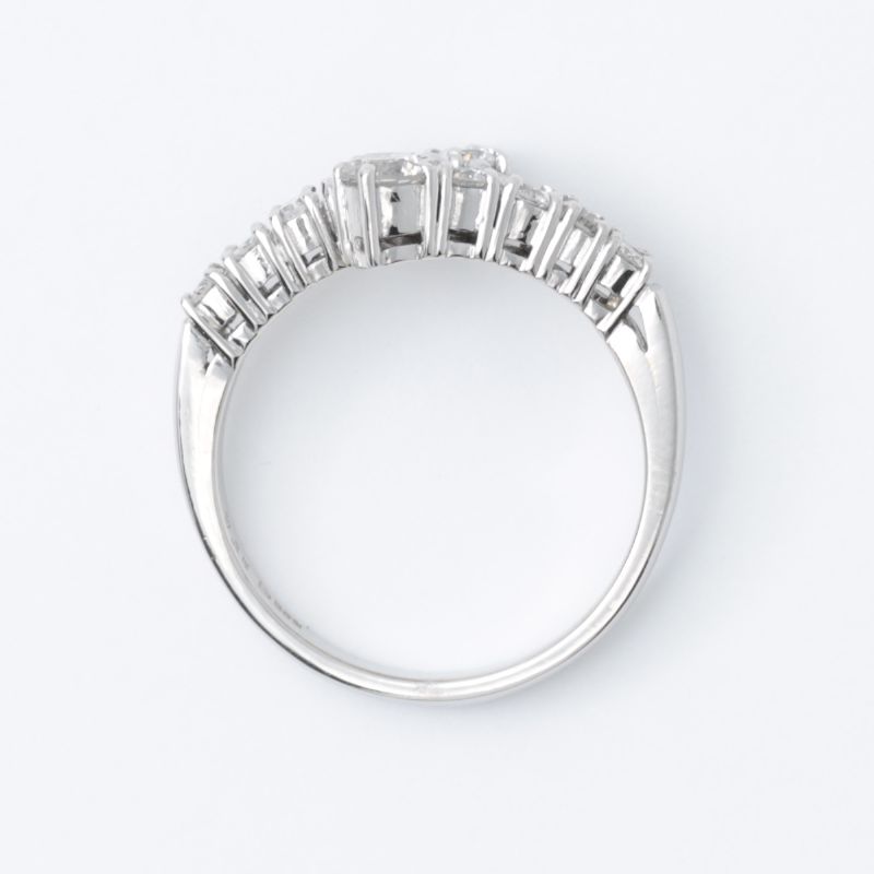 センター部分は、左右から伸びたメレのラインがふわりと重なり合う構造。