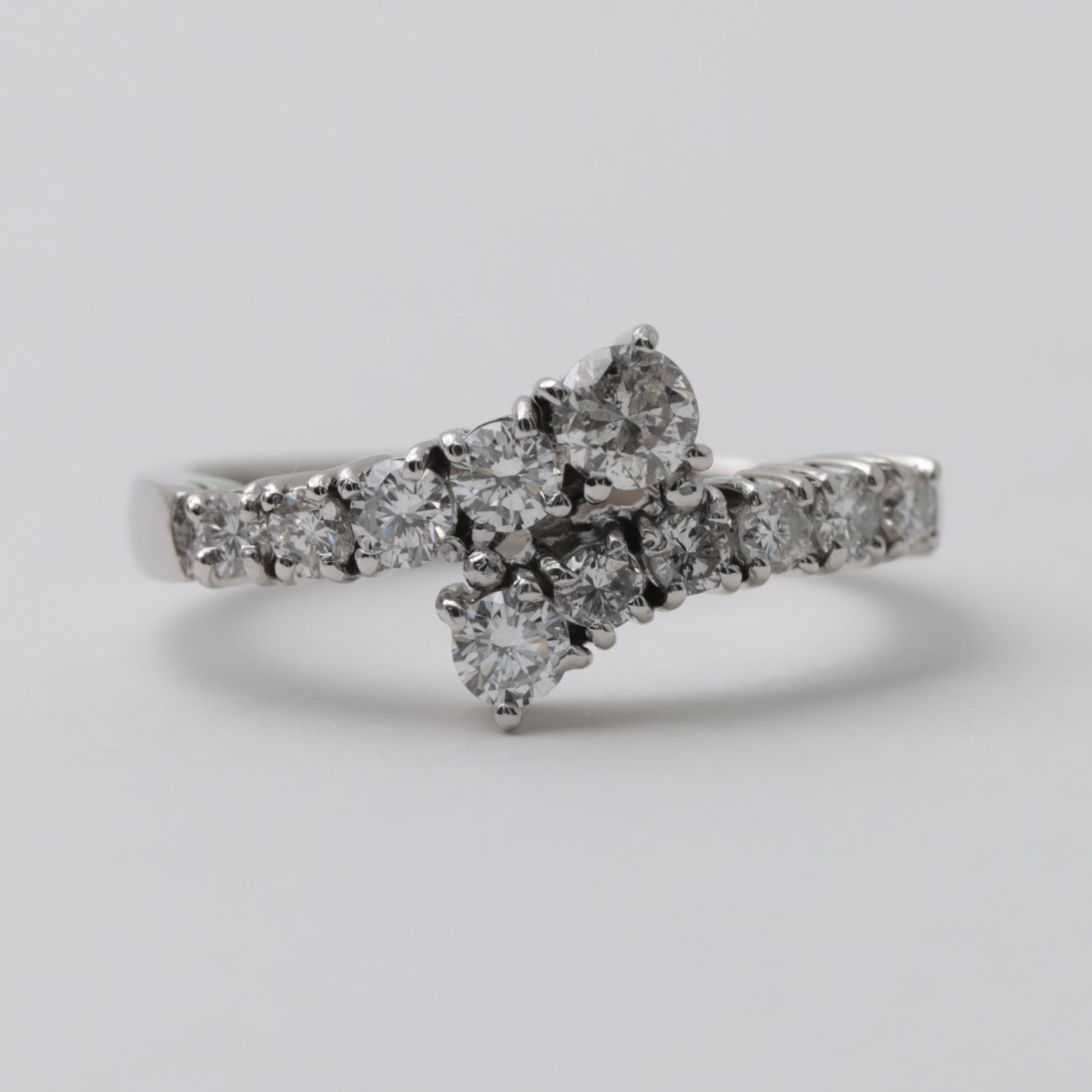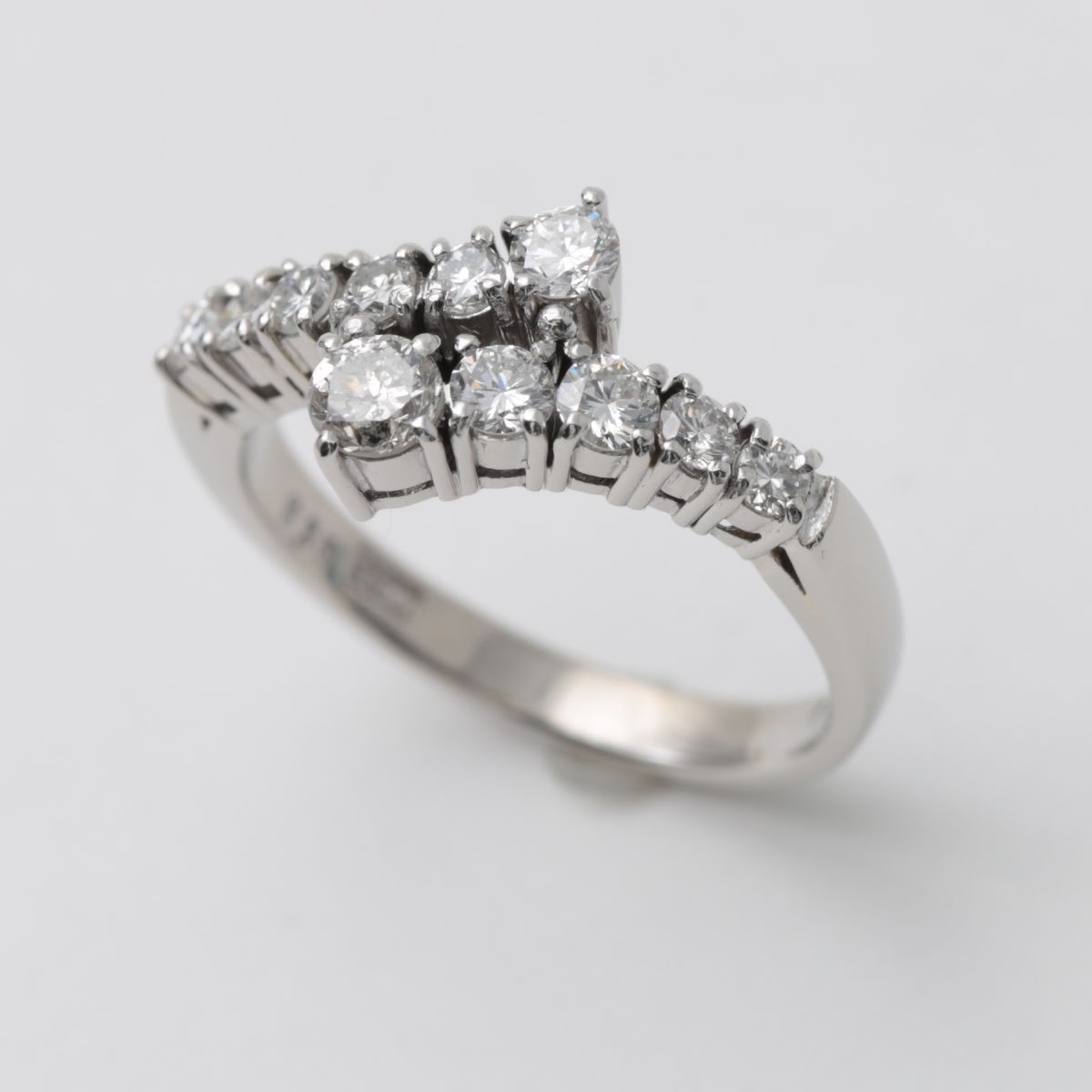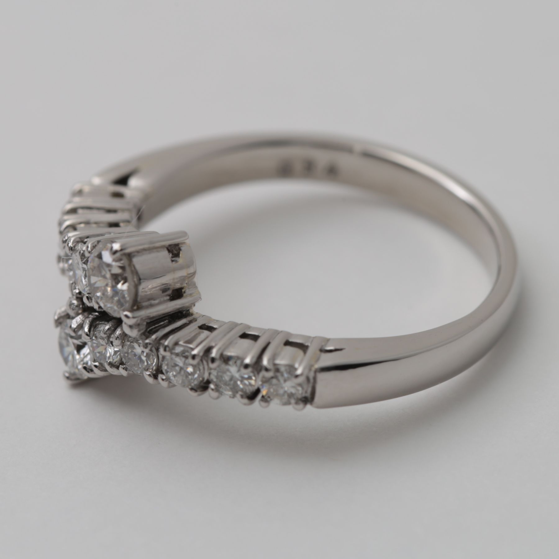 センター部分は、左右から伸びたメレのラインがふわりと重なり合う構造。