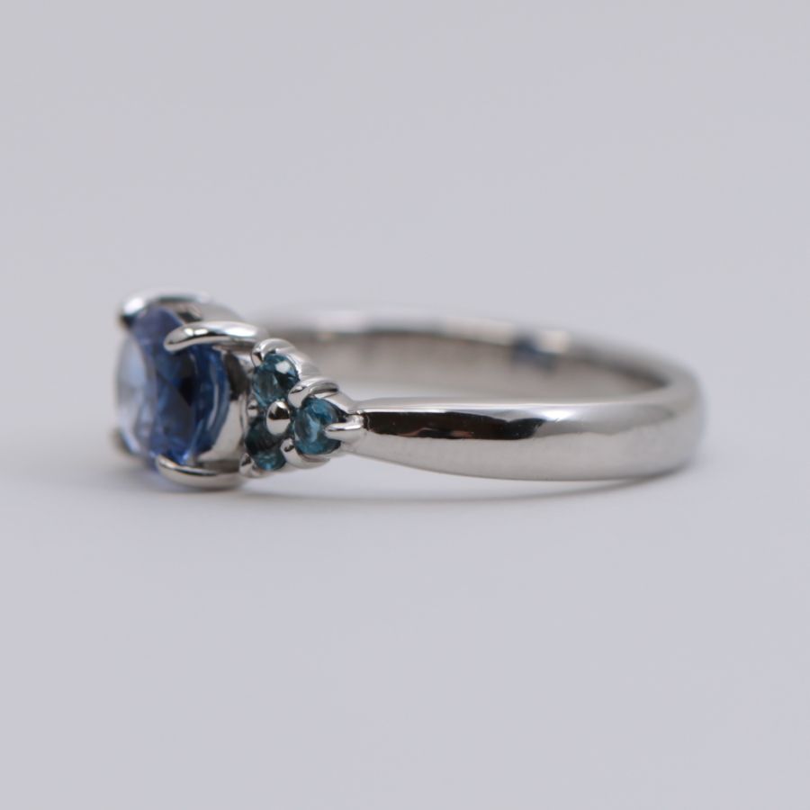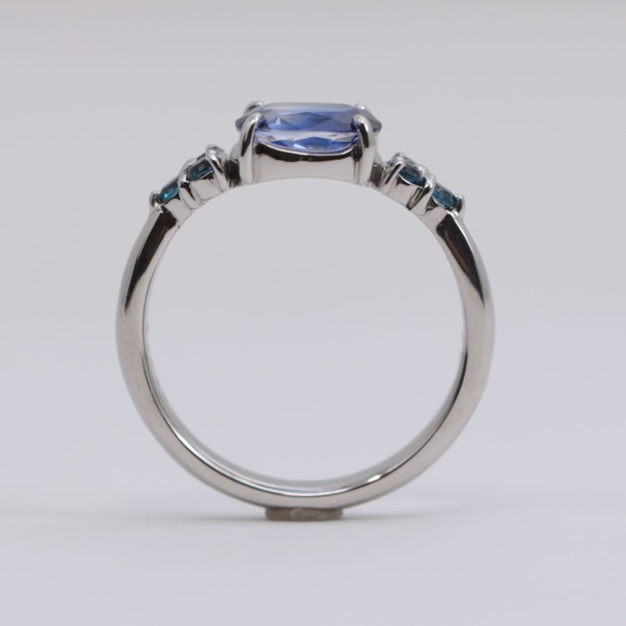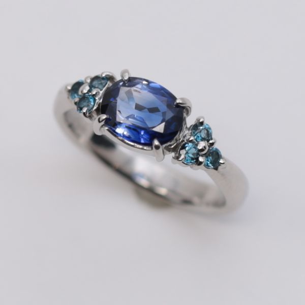 中心には気品あるブルーを湛えたサファイアを据え、その両脇にブルートパーズを3石ずつ、バランスよく配しております。