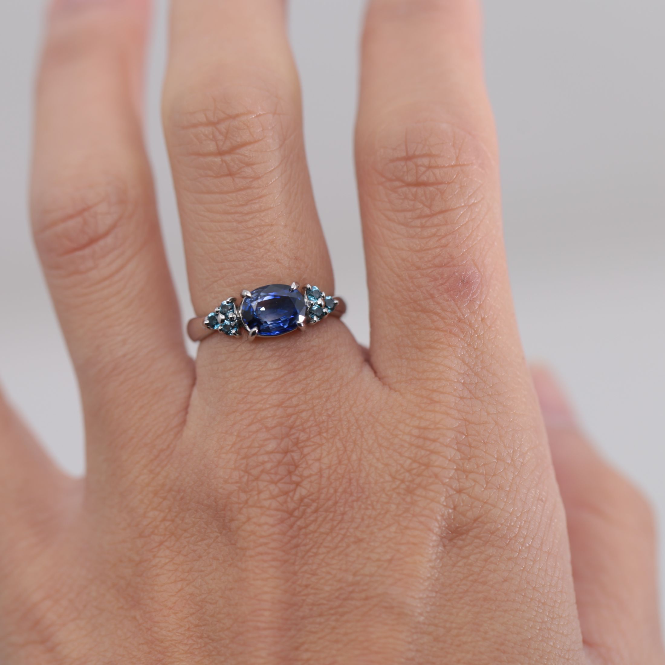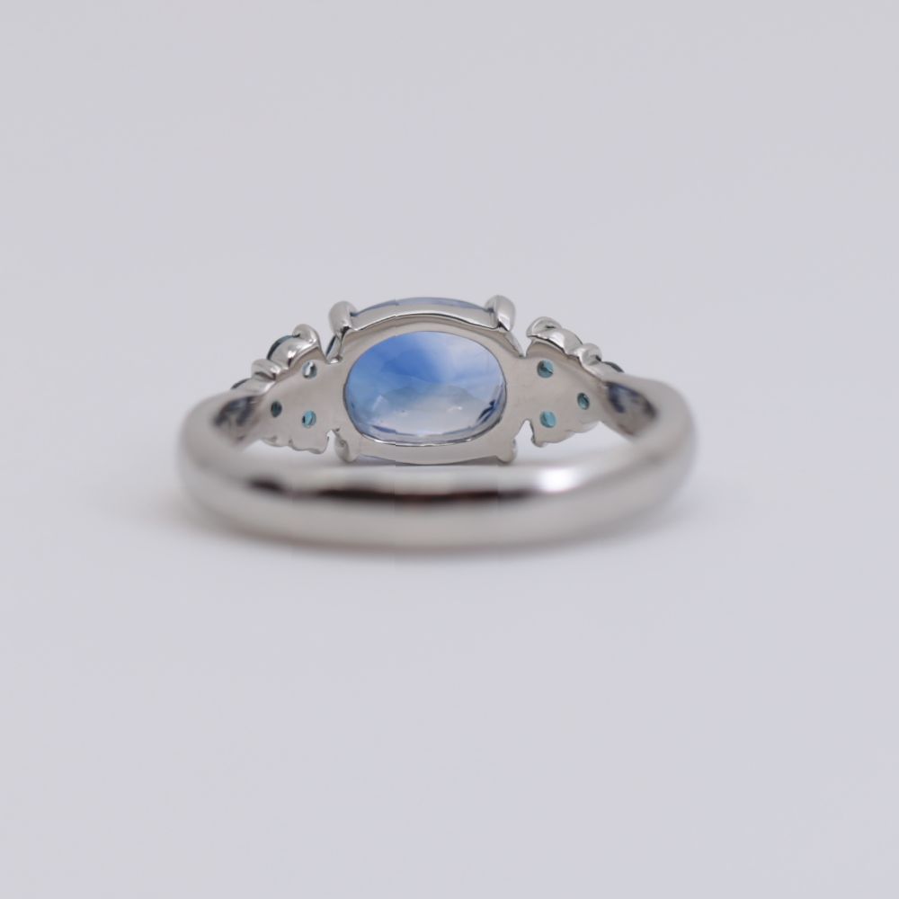 深い青のサファイアは落ち着いた存在感を放ち、その隣に寄り添うブルートパーズは澄んだ水面のような透明感を添えています。