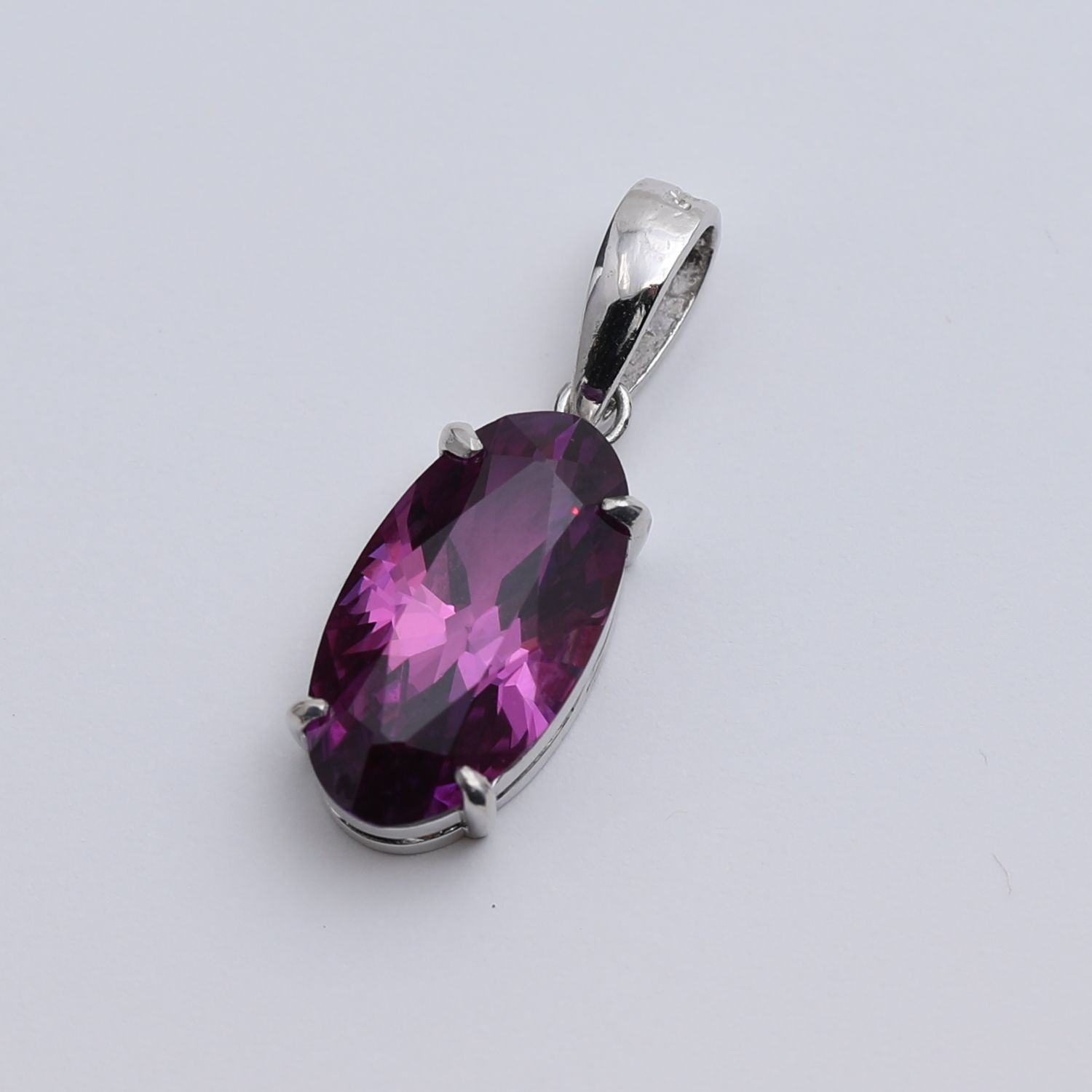 深みのある紫色が印象的なオーバル型のファセットカットストーンを、シンプルに4本爪で留めたPt900製のペンダントです。