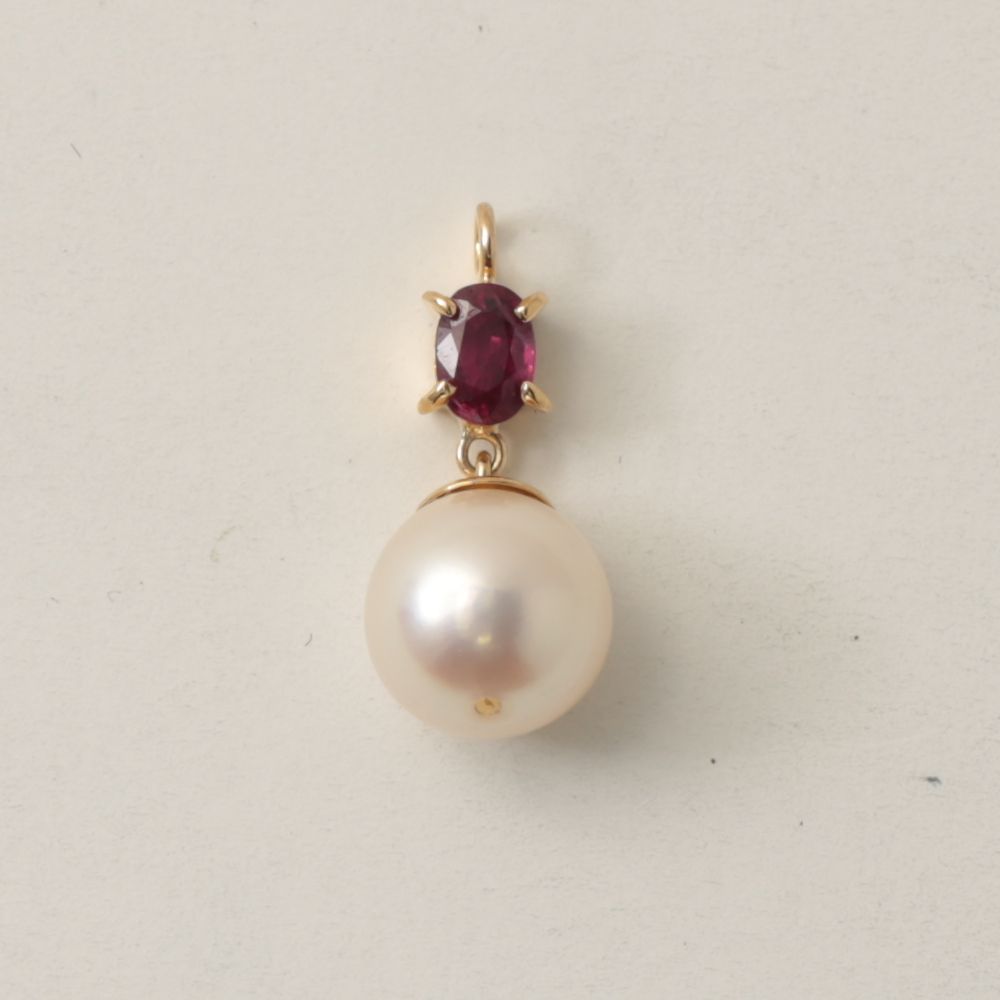 シンプルな縦の構成ながらも、素材のゴールドが赤色石の深み、そしてパールの柔らかな光沢が絶妙に調和し、クラシカルな雰囲気を演出しています。