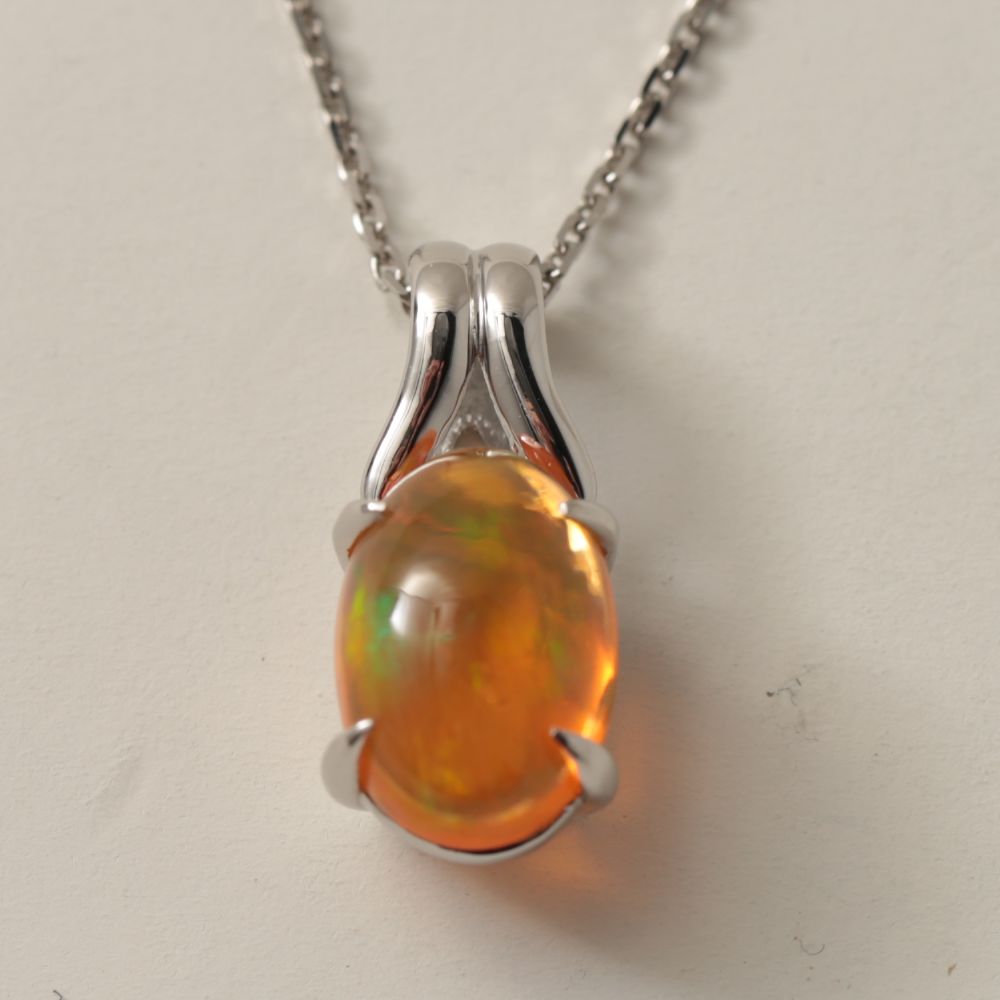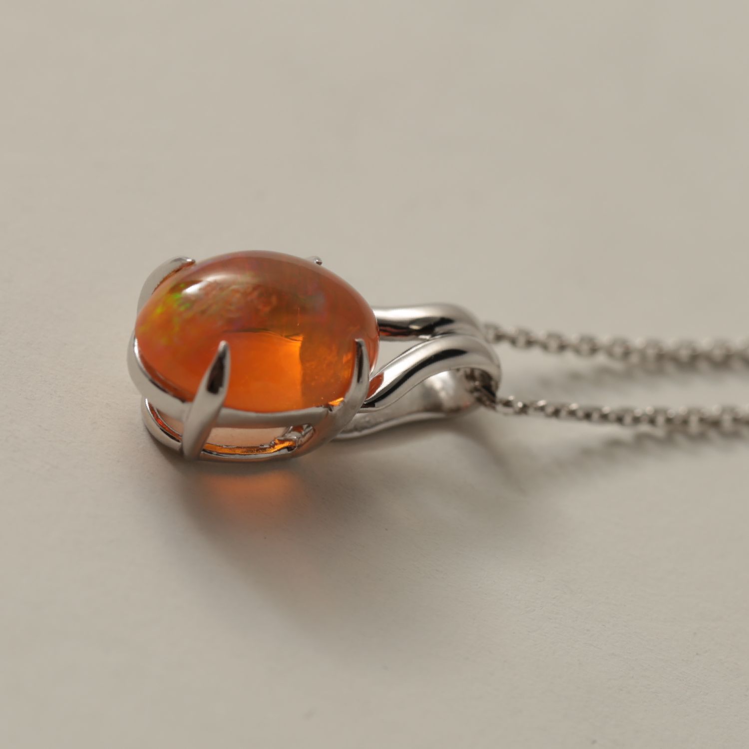シンプルな4本爪で留めることで、メキシコオパール特有の鮮やかな炎のような色彩と、豊かな遊色効果をより一層お楽しみいただけます。