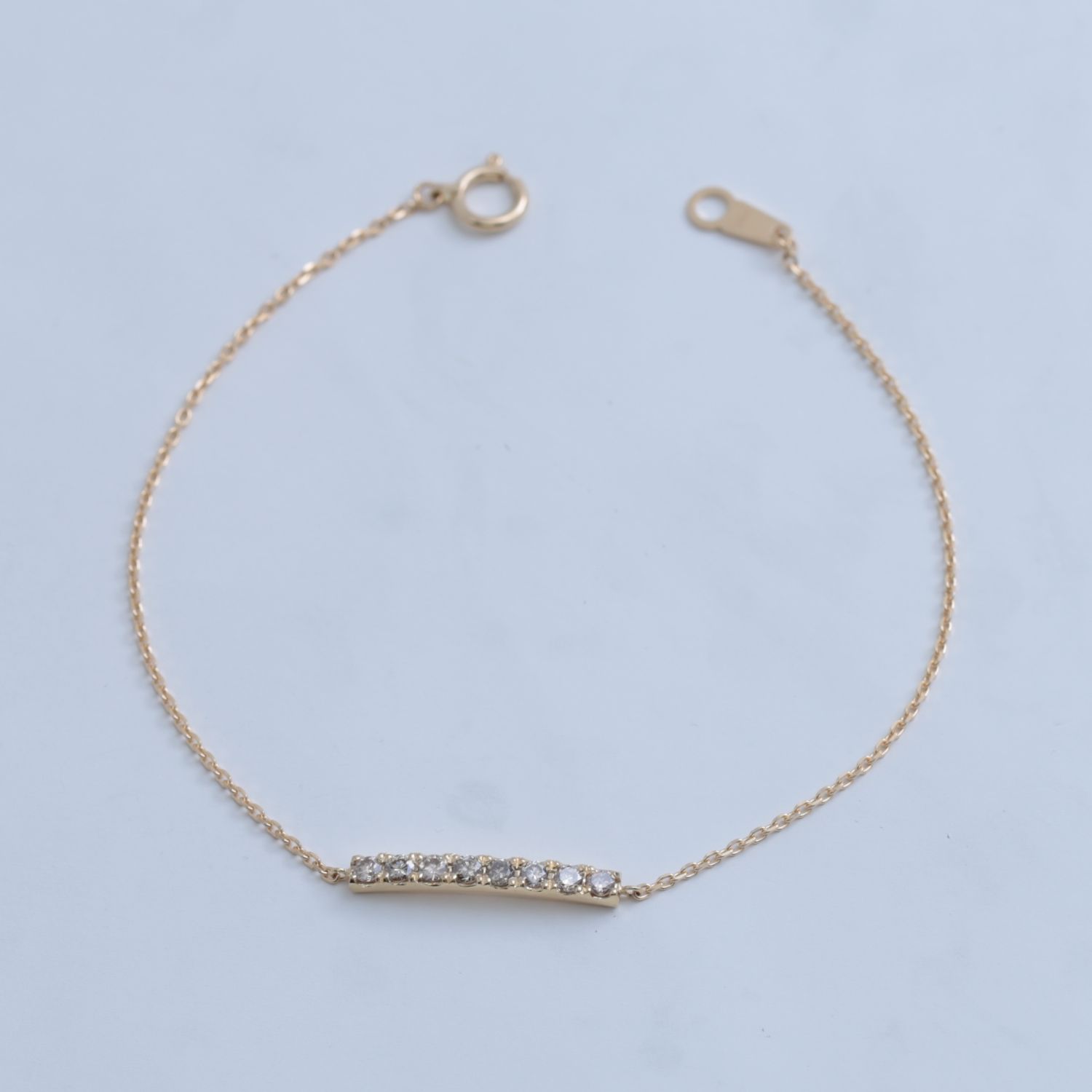 K18イエローゴールドのしなやかな地金をベースに、8石のメレダイヤモンドを並べてセッティング。