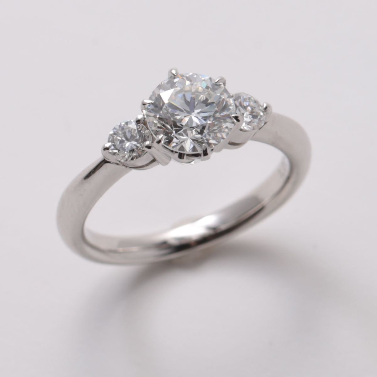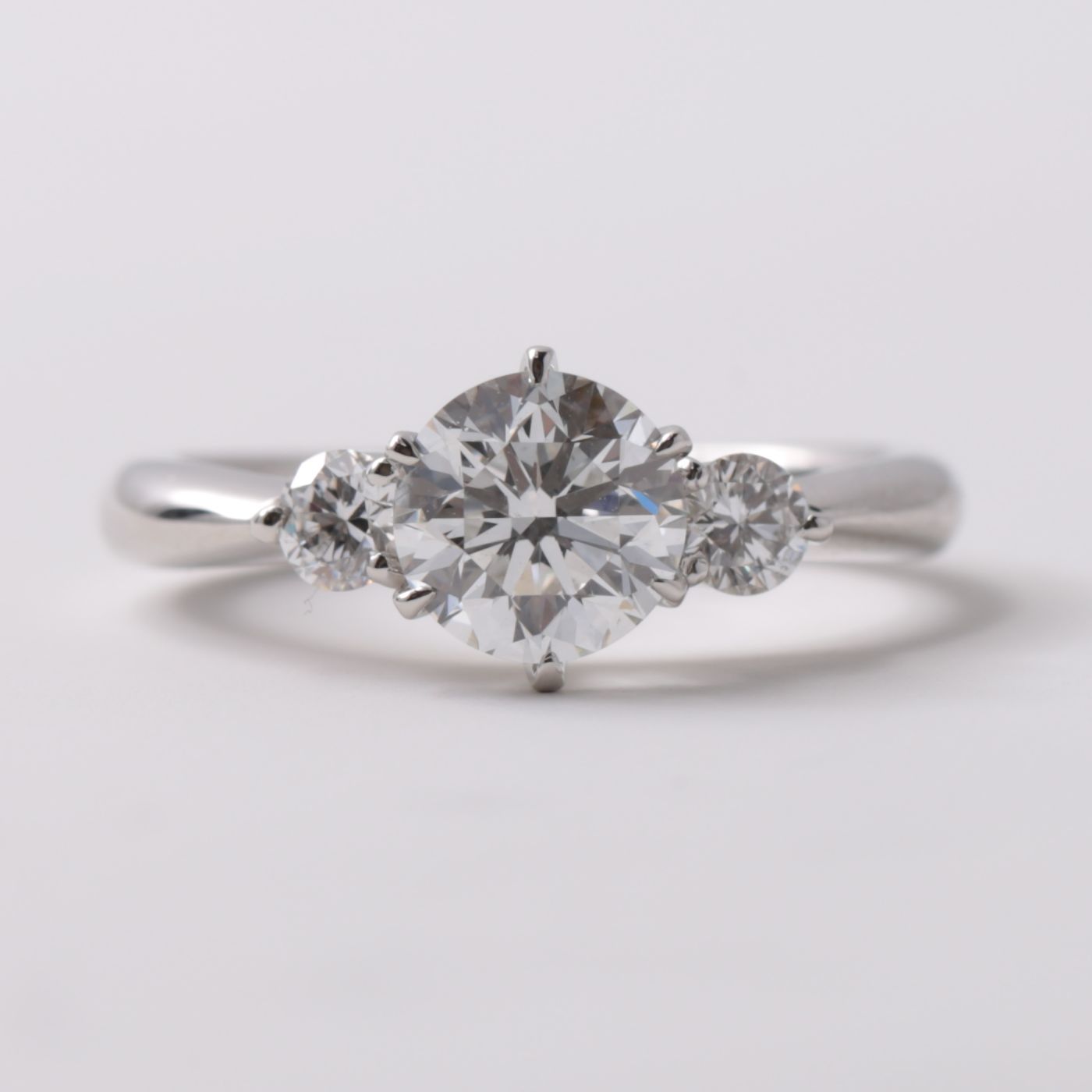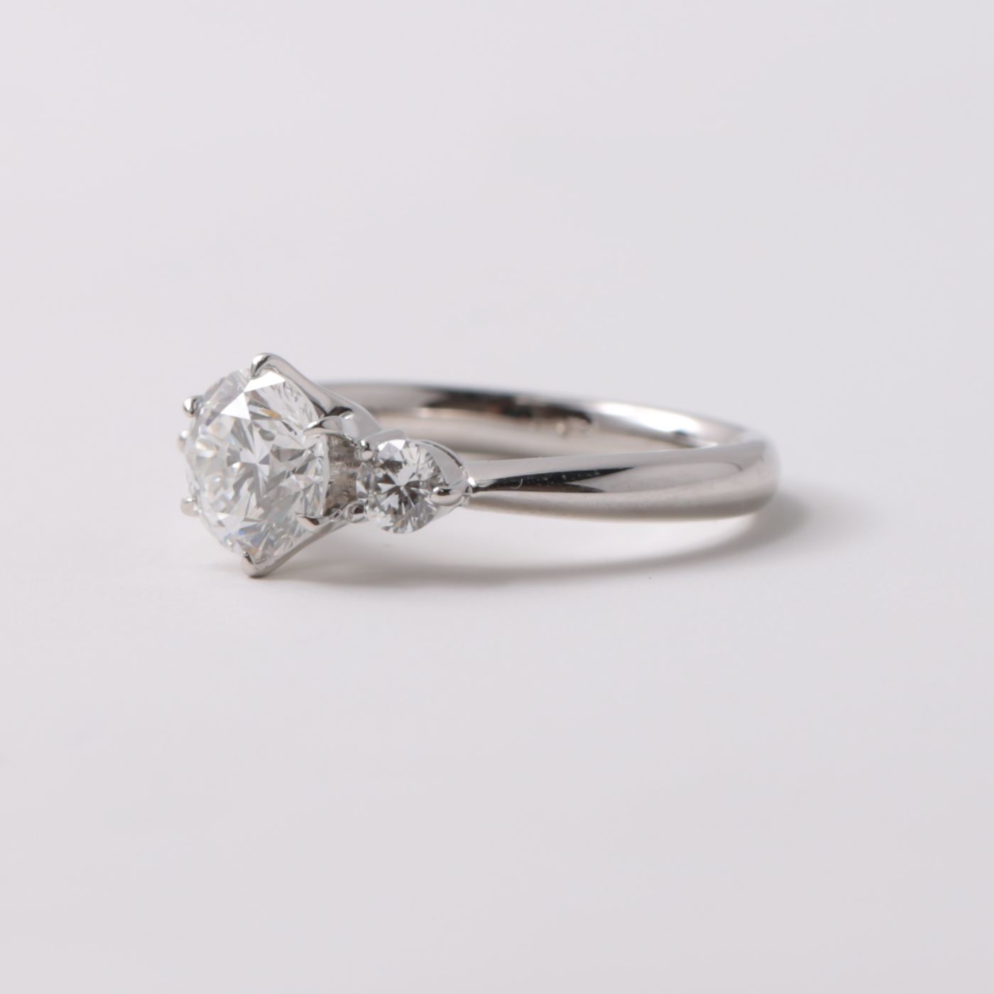 中心には、1カラットを超える存在感あるダイヤモンドをセッティングし、両サイドにメレダイヤモンドを添えたサイドストーンスタイル。
