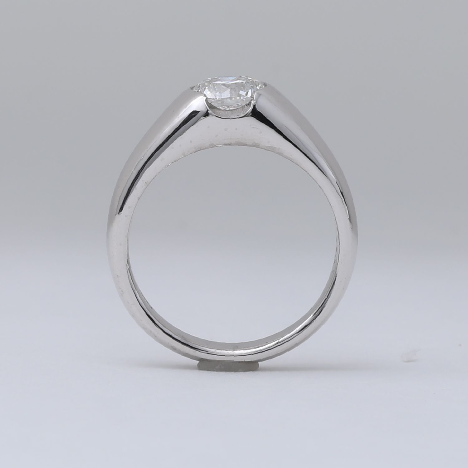 1カラットの直径に合わせて一文字型でお作りするよりも軽やかさが生まれ、指元にすっと溶け込むような上品なシルエットに仕上がりました。