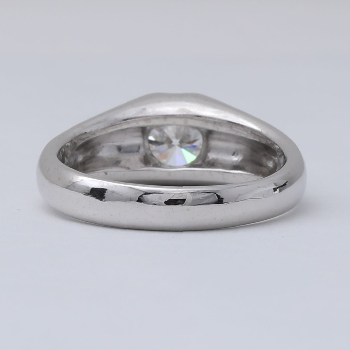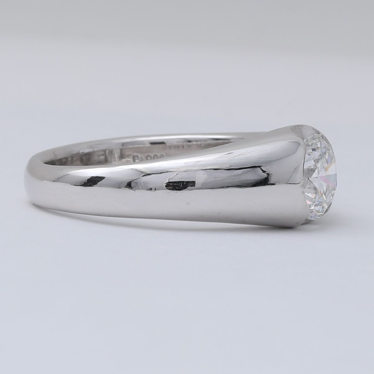 ダイヤモンドはガードル部分をPt900で包み込み、滑らかにアームへと続くデザインに。